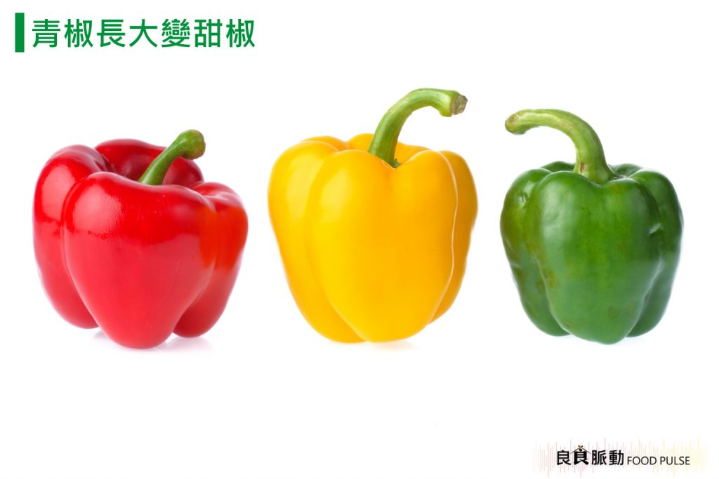 如果不採收,等待果實完全成熟,就會因茄紅素增強而轉變為紅色或橙黃色,醣類升高,滋味較甘甜,我們稱它「彩色甜椒」,因此青椒、甜椒都是同一種。