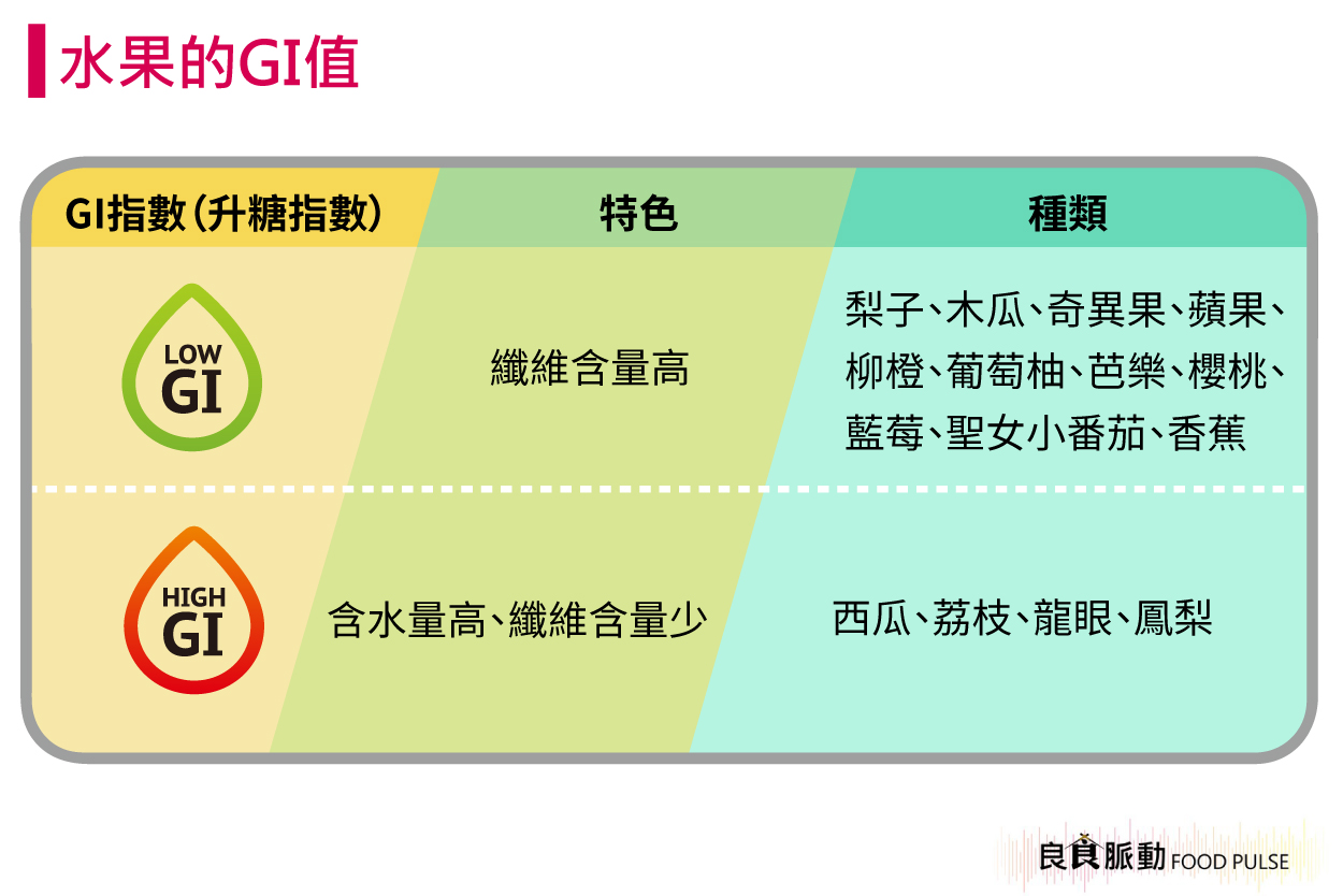 在選擇水果時,重點應該在於它本身的維生素、礦物質,還有所攝取到纖維能否幫助消化,而非甜度。所以首先可以根據水果的GI值(升糖指數)作選擇,GI值愈低的,通常纖維含量越高,如:梨子、木瓜,GI值偏低,奇異果、蘋果、柳橙、葡萄柚、芭樂、櫻桃、藍莓、聖女小番茄、香蕉也屬於GI值不高的水果。