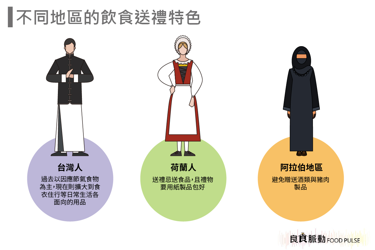 但不是每個國家,都習於使用食品作為禮物,像是荷蘭,食品反而就是一類應當避免贈送的禮品類別,由於在荷蘭,人們大多習慣吃生、冷食品,送禮忌送食品,且禮物要用紙製品包好。