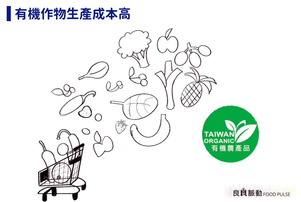 上述規範減少了土地利用率並增加額外時間及生產成本,生長環境的維護也比一般作物需更費心。上市前,如農產品經過農民嚴格挑選,能進入市場的量又比收成時更少,即使政府對有機產業有許多補助,但還是不敵高成本的生產方式,最終也只能反應在價格上。