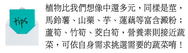 基本上,會使用「營養素的比例」原則,將可食用的植物莖分成幾種: