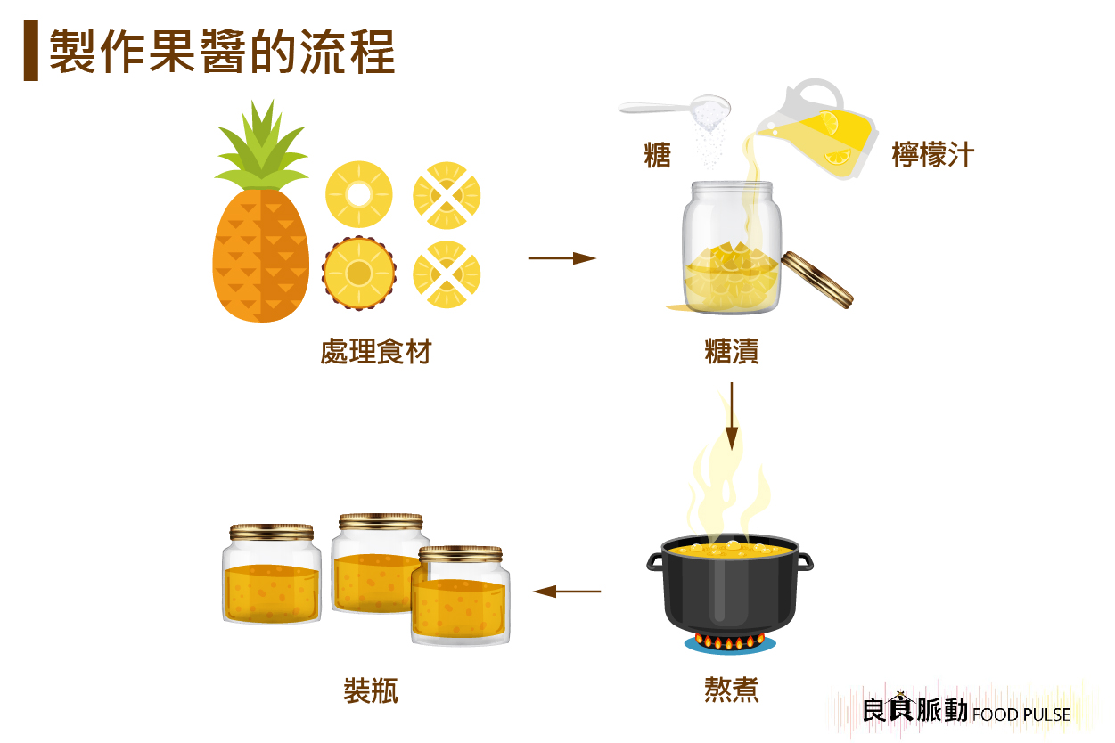 以鳳梨果醬為例,製作的關鍵步驟如下: