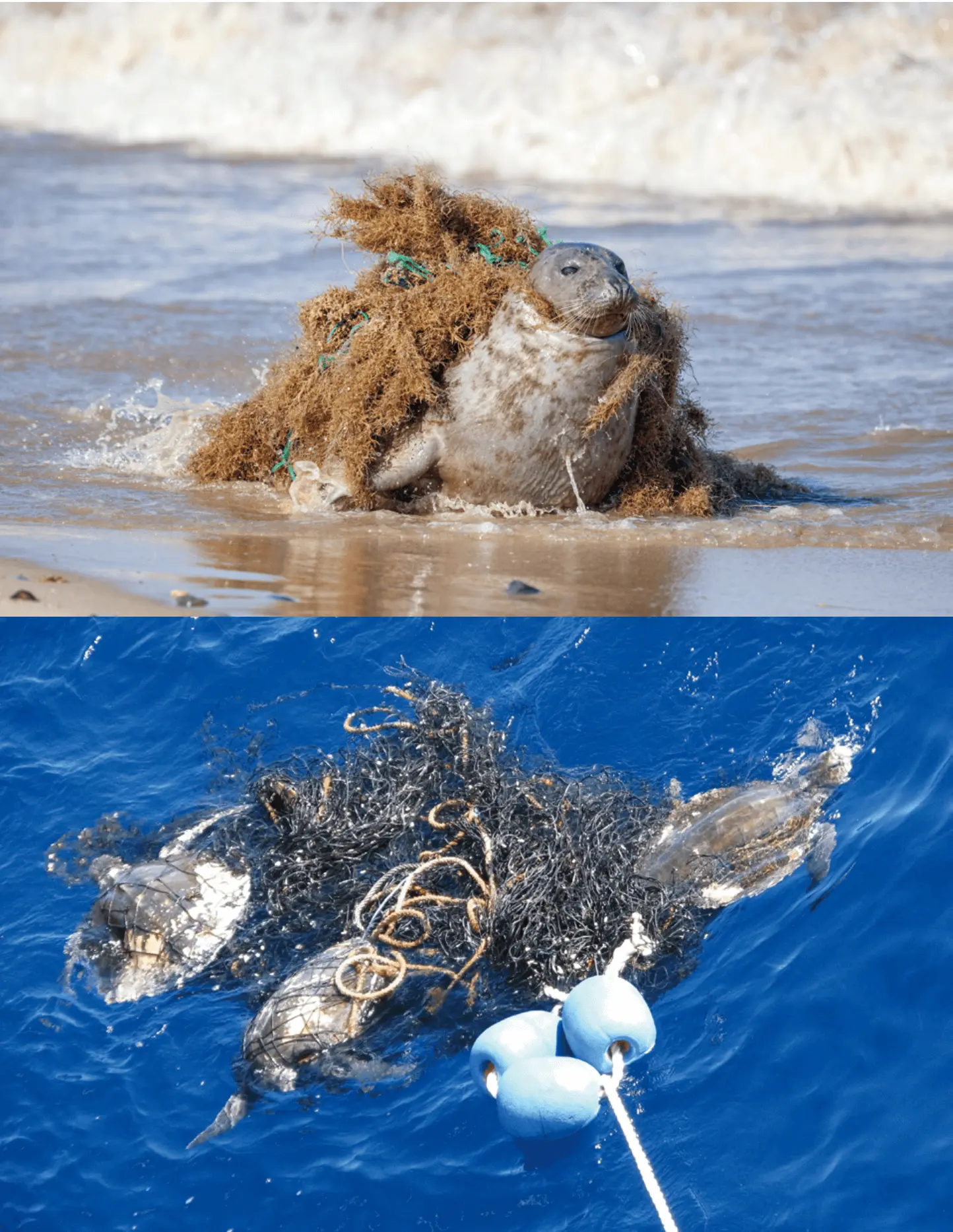 張卉君提到,這些廢棄漁具不僅會漂浮在海水表面,也有非常多依然存在於海洋底下持續地成為捕撈現象,但這些被困住的漁獲人類吃不到,當然也無法換算成更高的生產力,例如臺灣常見的家計型沿近岸捕撈漁網「刺網」,容易造成生態的混獲跟纏繞,如果這些漁網遭到廢棄掉入海裡,因為看不清楚,海洋生物還是會持續地中網,所以被稱為「鬼網」;不同的船隻及漁法也會對海洋生物造成影響,像是比較遠洋會使用的「拖網」「延繩釣」等,雖然漁民並非有意要撈捕海龜,但許多海洋生物卻會一併被打撈上岸;另外,有時若太多廢棄物覆蓋在珊瑚礁周邊,等浪來或大潮時,可能會對珊瑚礁產生帶動和拉扯而造成傷害。