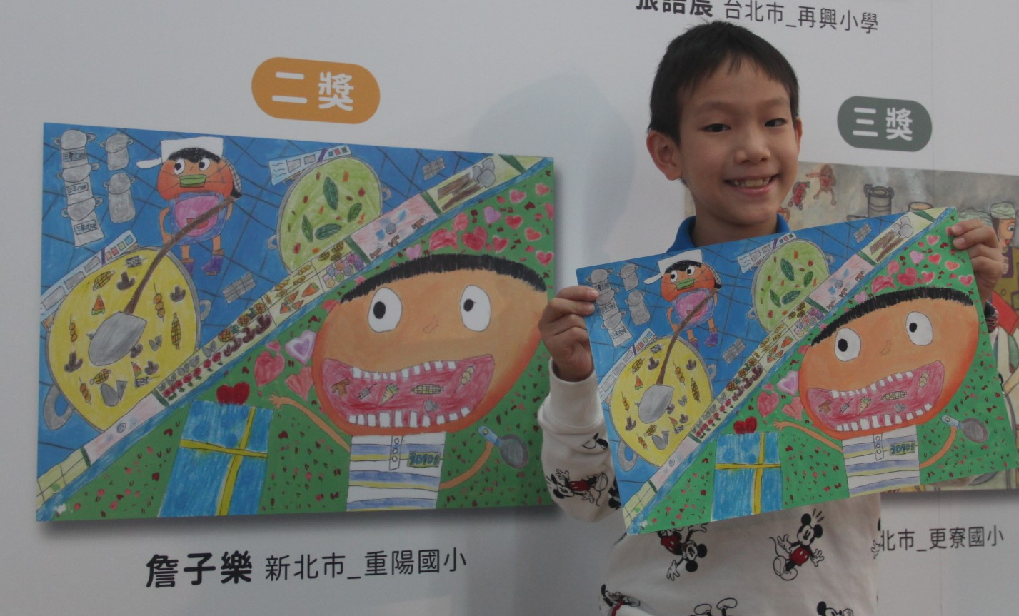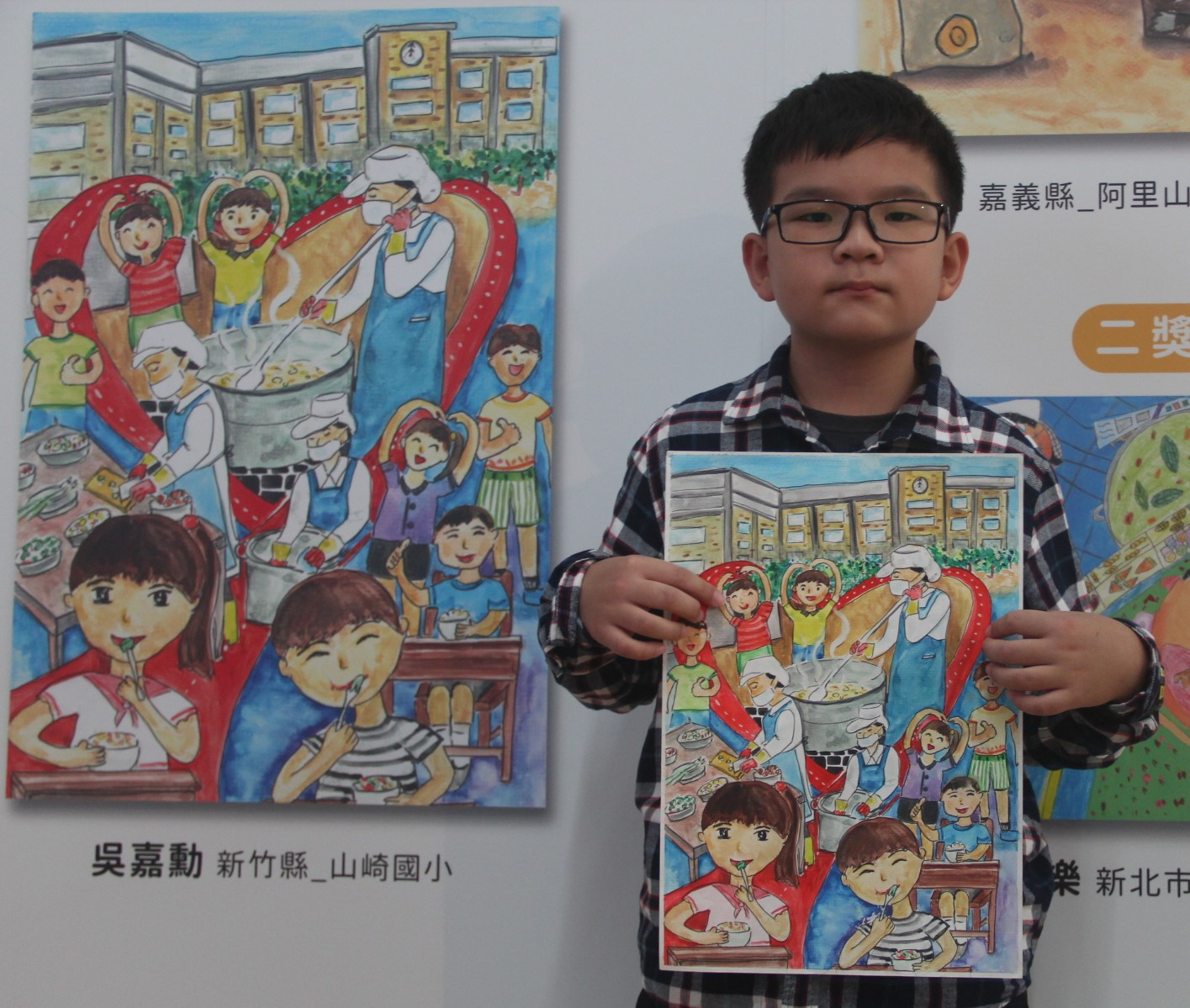 獲得二獎的新北市重陽國小詹子樂也說,平時吃營養午餐,他特別喜歡香菇、胡蘿蔔等一般同學不喜歡的料理,藉由這次比賽,也更認識校廚的工作內容,直呼和媽媽在家做菜差別很大,真的很不容易,他想對校廚阿姨們說聲「辛苦您了!」嘉義縣阿里山國中小的葉宗諭獲知得到二獎時,興奮跟家人分享創作理念,他將自己午餐中最喜歡的料理融入畫中,也感謝廚房媽媽每天煮好吃午餐給全校師生享用。