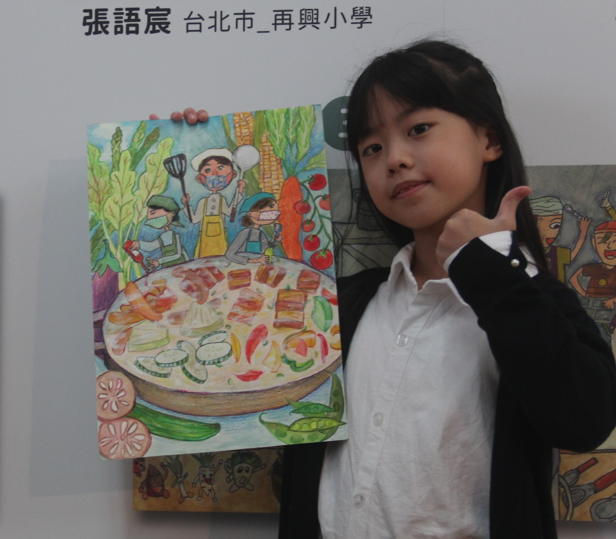三獎得主、台北市再興國小的張語宸以童話故事插畫方式去描繪校廚烹飪場景,她說因為喜歡畫畫,可以開心發揮創意,所以把喜歡吃的菜色都畫進作品裡,「鍋子裡有香腸、小黃瓜、三層肉都是我喜歡的菜色,但我最歡的還是奶油培根義大利麵!可以吃好大一碗唷。」