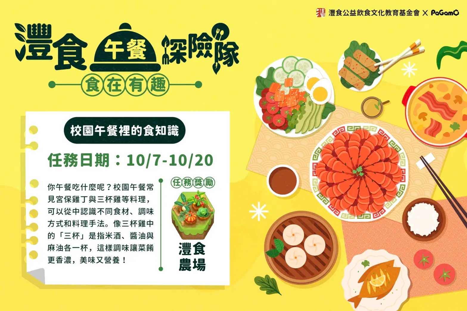 本次任務從每天吃的食物中學習飲食知識,深入了解料理的文化背景,讓平凡的午餐時間變成美味知識的冒險旅程!即日起至10月20日止,登入PaGamO遊戲平台(https://www.pagamo.org/),不僅吃到營養,還能「吃出」滿滿的知識與樂趣!