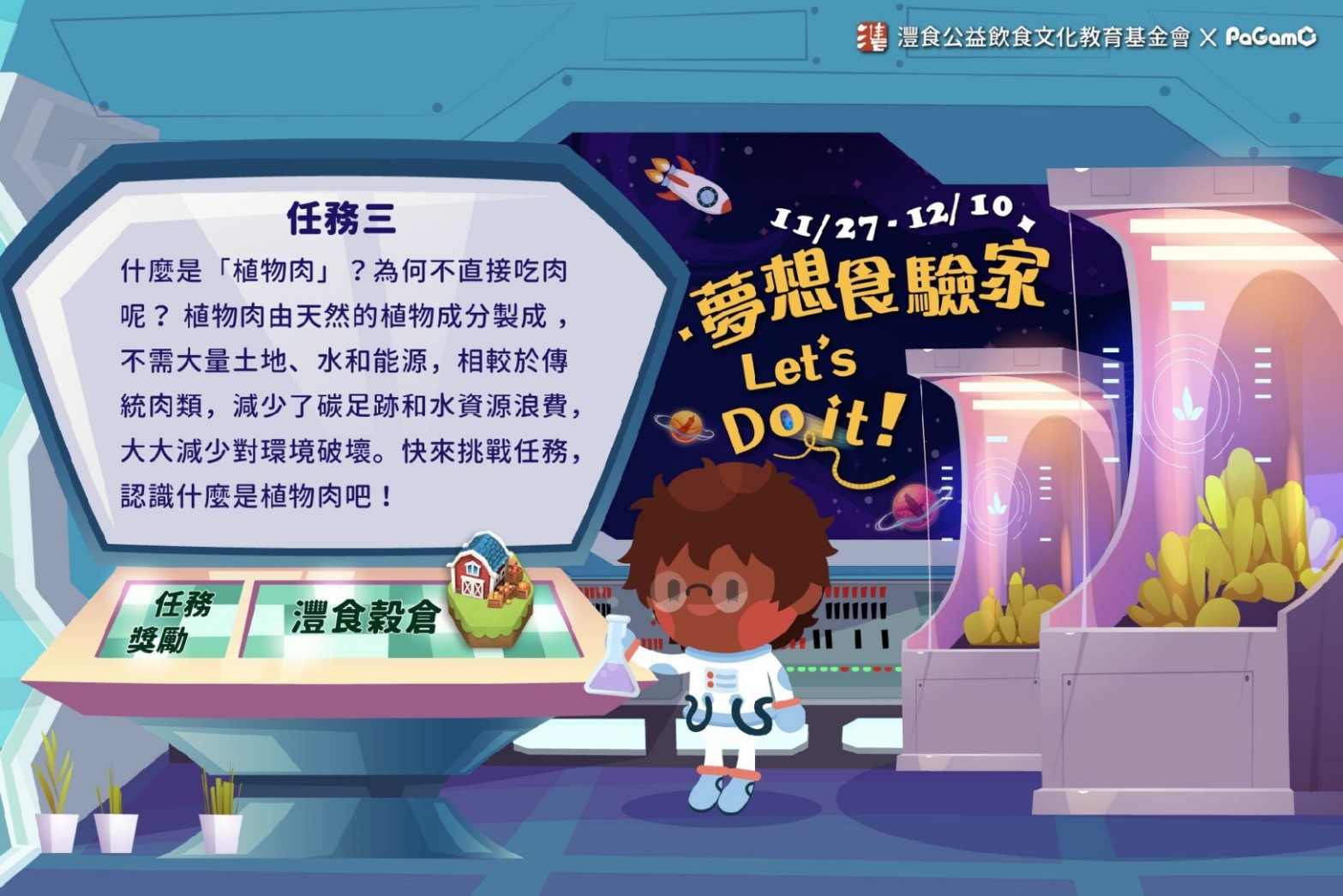 飲食知識該怎麼學?除了課堂授課外,灃食公益飲食文化教育基金會攜手多人在線遊戲教學平台PaGamO,把艱深的飲食知識生活化,推出多檔學童版飲食知識任務,累積一年已超過28萬人次學童挑戰,其中6成學童成功解鎖任務。今年最後一波任務「灃食夢想食驗家」(https://www.pagamo.org/)鎖定永續議題,目前已於PaGamO平台上線至12月10日,歡迎大小朋友一起來挑戰!
