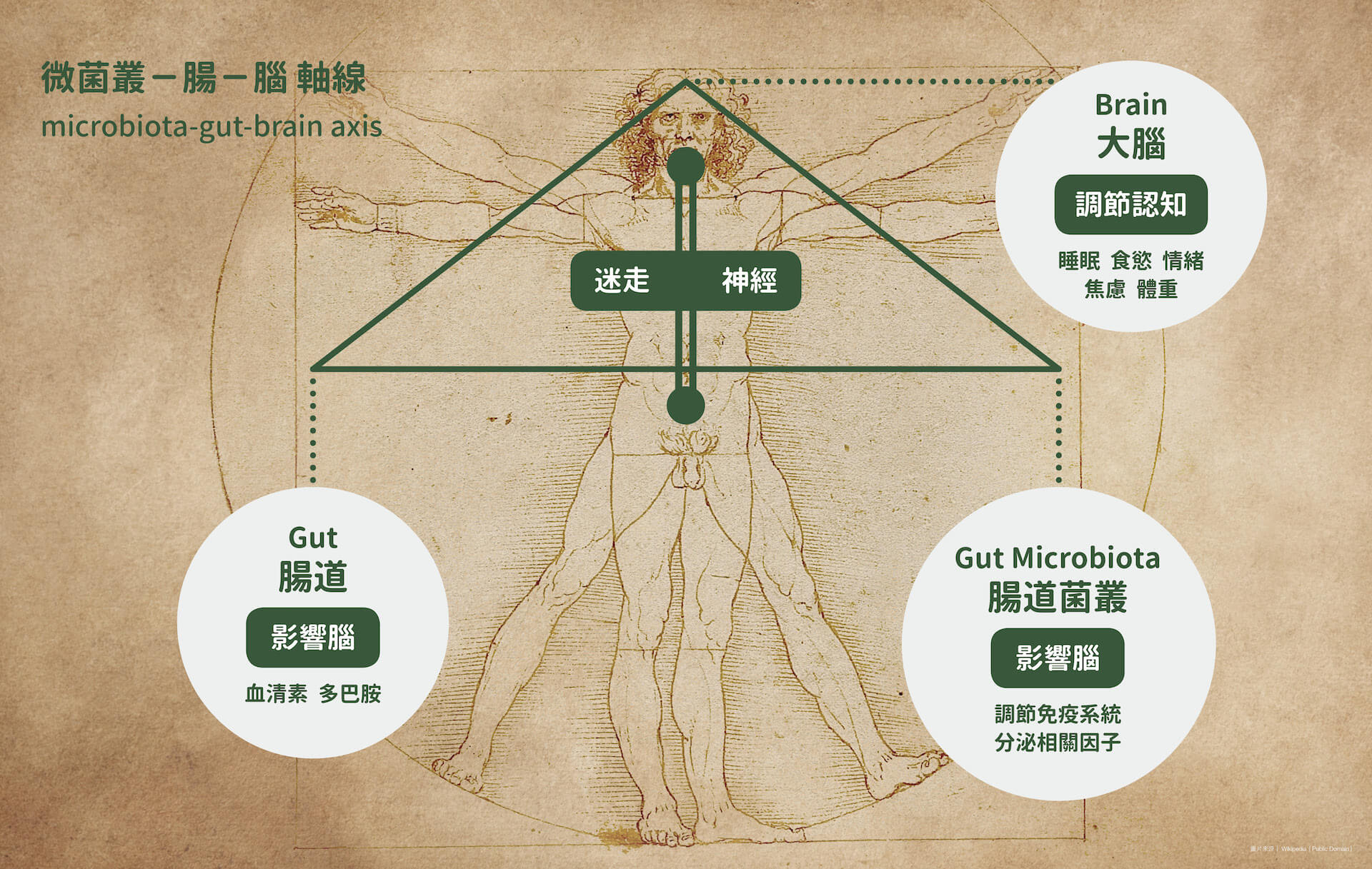 過去我們常認為,腸道是人體運作的末端,腸道菌只是排泄物,因此常會忽略它的存在。現在逐漸發現,這個曾經「被遺忘的器官」不僅重要,還是人體最大的「動態內分泌」器官,掌管著全身的健康,尤其是「代謝」和「免疫」,甚至也能影響到與「腦神經」,被稱為「腸-腦軸線」(gut- brain axis),簡單來說,大腦和腸道菌是有溝通的。近來愈來愈多科學家由下而上,去反向研究由腸到腦的影響,發現了腸道與情緒、焦慮、認知功能、自閉等息息相關。