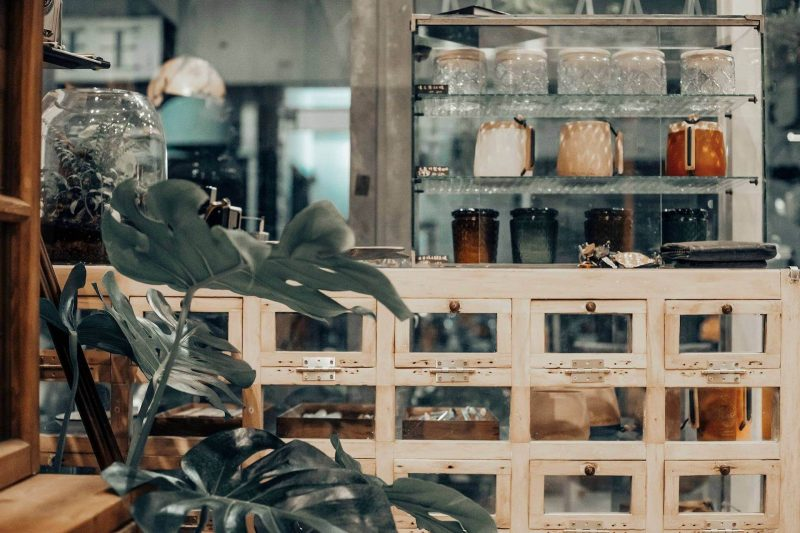 《山盟商行》賣的是一種生活型態,除了販賣食品、清潔用品之外,許多造訪的客人,也會特別注意到內部陳設的傢俱頗具巧思。比如說,有的櫃子是由窗戶邊框或由傳統的中藥鋪抽屜櫃翻新、並且運用各種素材DIY組合而成,如果再仔細觀察,還會發現他們會利用回收場中所撿到的破銅爛鐵,搖身一變成為裝飾空間的精緻鐵花窗。