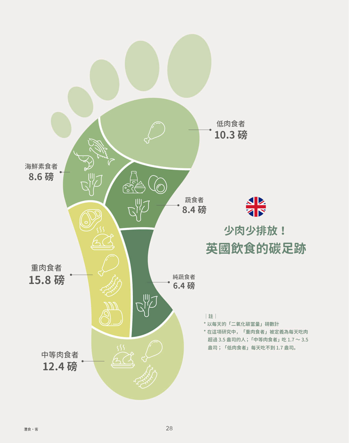 英國一項飲食研究發現,蔬食者所產生的食物碳足跡,大約是葷食者的一半,若是純蔬食者(Vegan) 所產生的食物碳足跡比例更為低,因此,只要減少選擇葷食,就能讓飲食所產生的碳足跡減少三分之一。