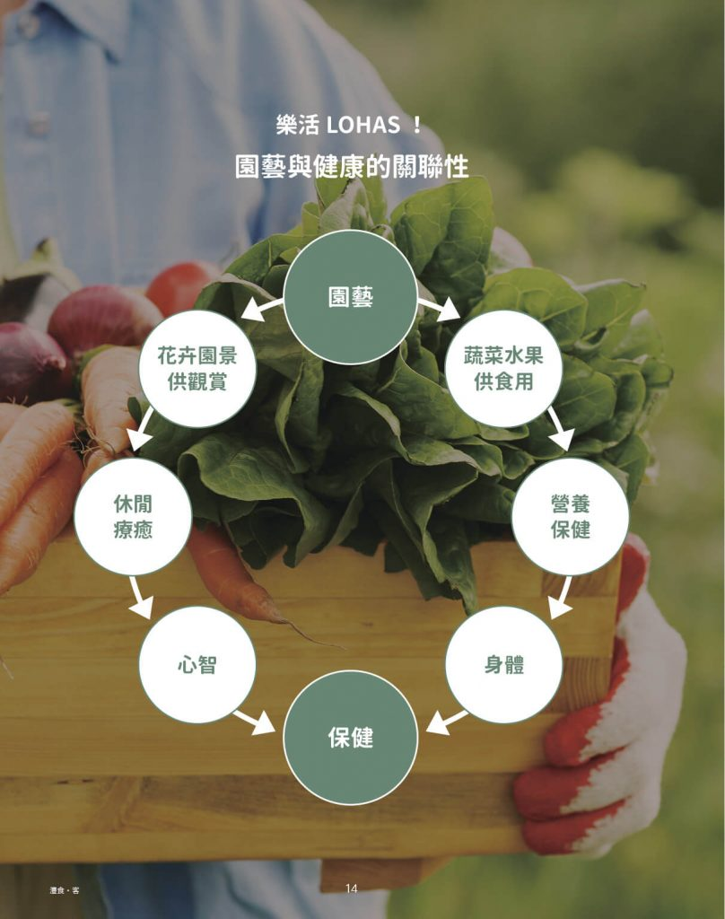 蔬果提供人類食用,補充人類身體上的所需養分;美麗的花卉植栽景觀,也會讓我們感到賞心悅目而療癒心靈。從生理或心理上,蔬果花卉植栽皆提供人類所需的養分,因此,園藝使得身體和心理獲得療癒感,唯有如此,才能說,我們的生活獲得了保健。
