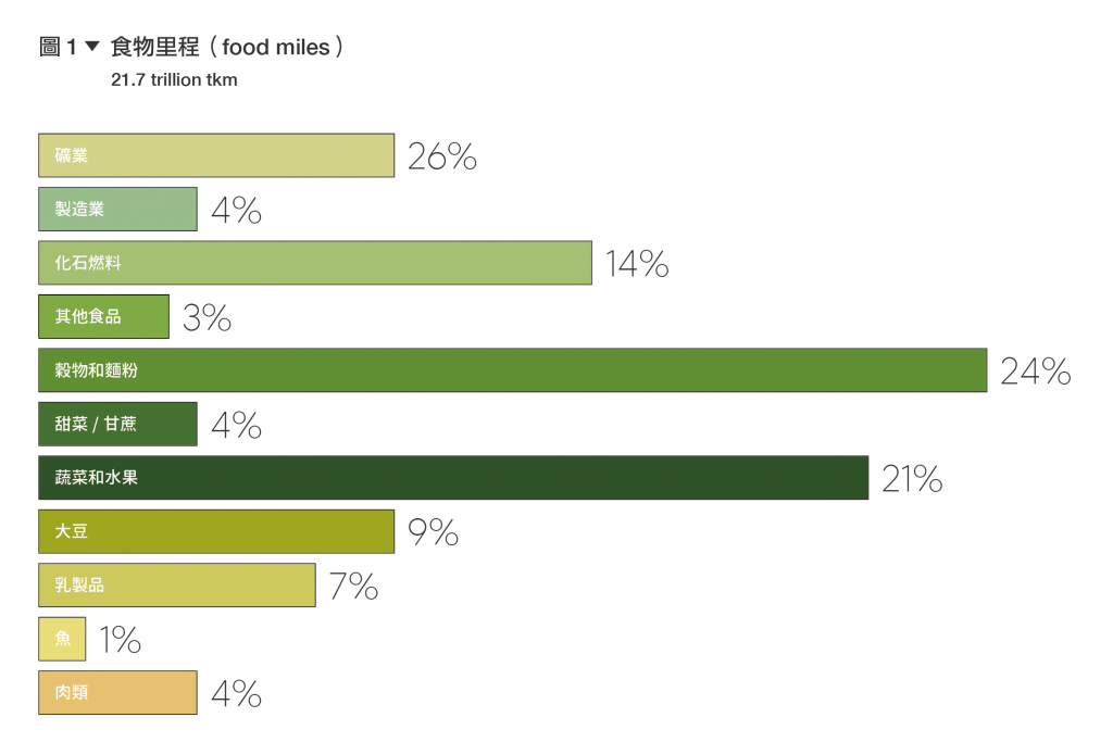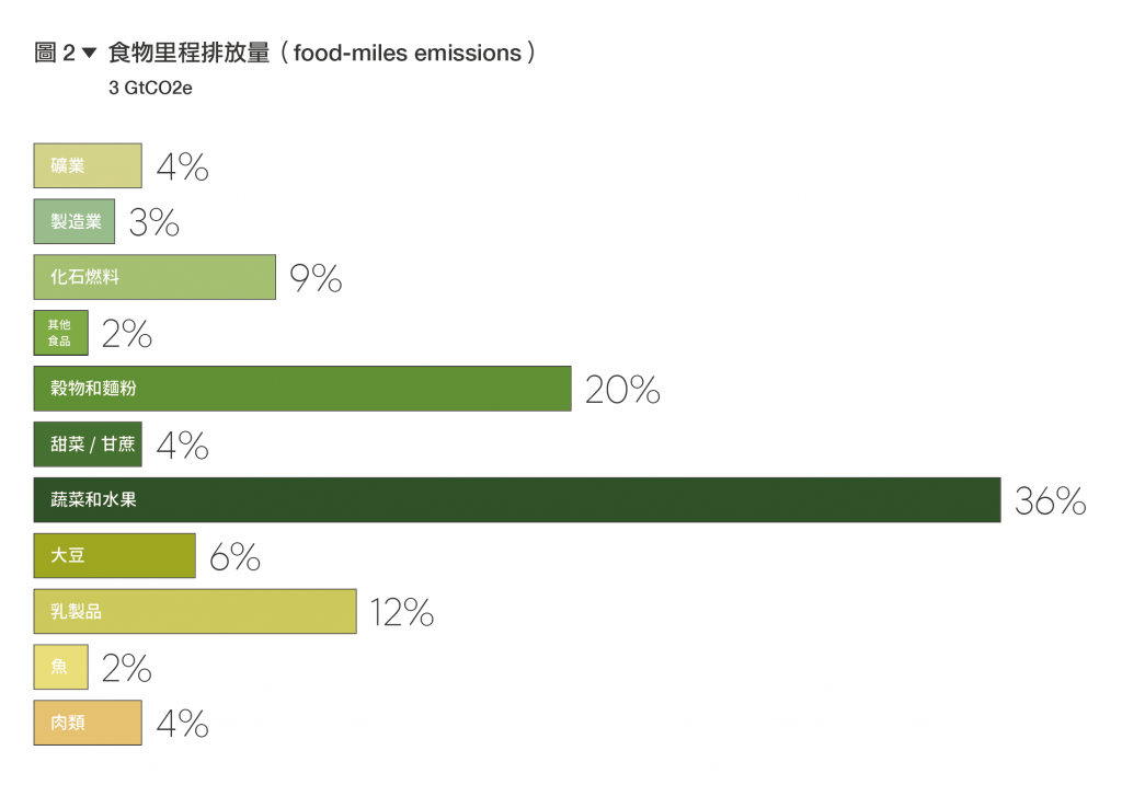 根據2022年6月發佈在國際期刊《nature food》的研究《Global food-miles account for nearly 20% of total food-systems emissions》指出,全球糧食系統佔人類產生的溫室氣體排放總量的30%左右,其中「食品運輸」就約佔了其中19%(源於運輸、生產和土地利用的變化),需要溫控運輸的蔬菜和水果,佔全球「食物里程排放量」的三分之一以上。對此,研究呼籲除了轉向以植物為基礎的飲食外,也要盡量採取「在地飲食」,與更多本地生產的產品相結合,減少因食物運輸造成的溫室氣體排放。