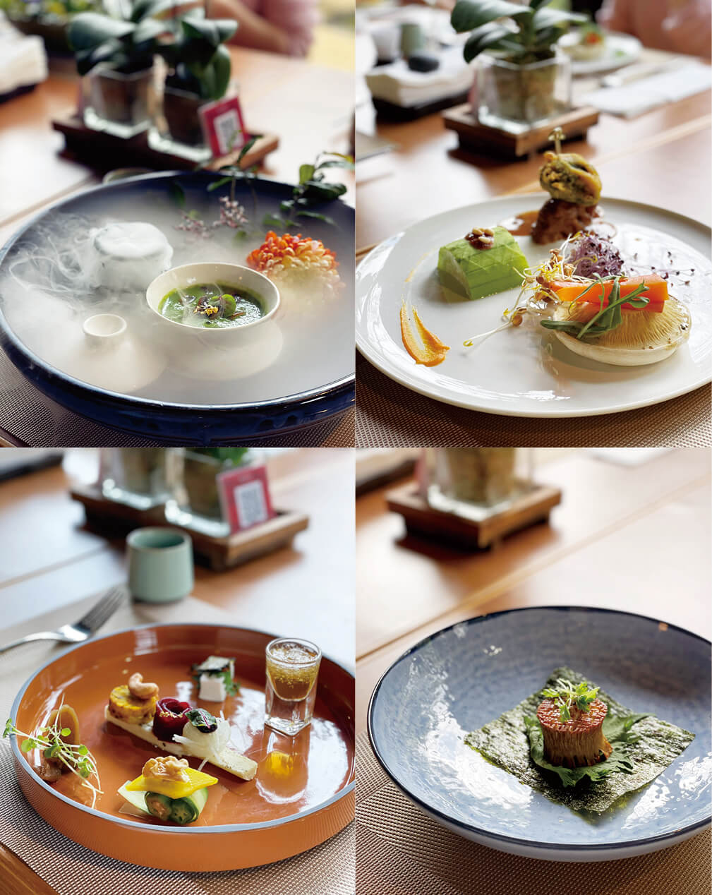 套餐冷盤「食物的靈魂」,選用牛蒡、桂圓、秋葵、黃瓜、山藥、豆腐、紫蘇、甜菜根等台灣在地小農當季食材,精湛刀工及細緻擺盤引人入勝,咬下的第一口能品嘗到食材原味,在口中幻化成曼妙滋味。這道菜特別將食材盛放在歐洲進口的土黃色瓷盤上,傳遞食材需要土地的滋養的意義,也說明靈魂需要純淨的食物,心靈與環境都不要受污染,藉此喚醒蔬食、永續與健康環環相扣。