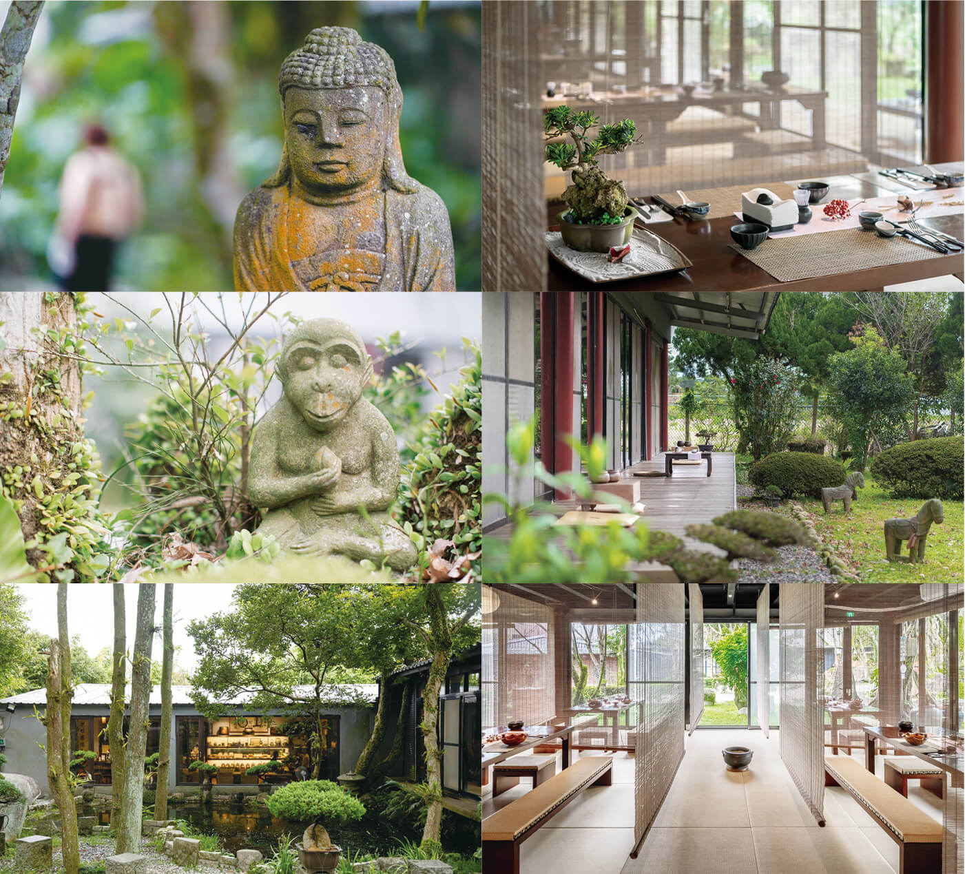 園區中佇立著大尊觀音與彌勒佛石雕像,環繞著寧靜氣氛,陳健宏分享,這些佛像是前屋主留下來,已有四、五十年歷史。「陽明春天」的地主當初是賣石雕像的,剛開始差不多有三百多尊雕像,因此他善用佛像所形塑出的氣質,讓園區傳遞「三敬」精神,就是營造讓人清靜、心靈得以回歸的「環境」;飲食讓人得以安心的「純淨」;最後就是擁有一顆敬畏天地的「恭敬」的心。