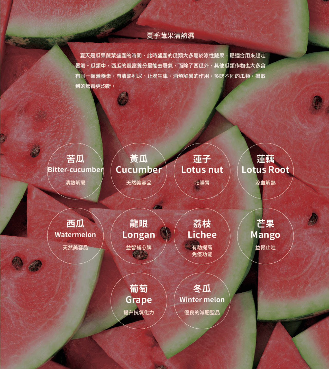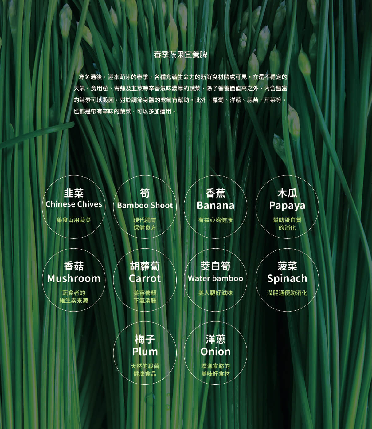 在台灣,由於四季分明且不斷循環,先人運用智慧判斷什麼樣的氣候,知道該種什麼。隨著蔬果品種改良、農業技術的進步,只要是你想吃的各種蔬果,幾乎一年四季都可以吃到,但灃食智庫委員、國立屏東科技大學食品安全管理研究所所長吳明昌呼籲,盡量要順應自然,選購蔬果還是以當令的最好,並歸納出善於選擇四季盛產食材,來吃出健康與美味。