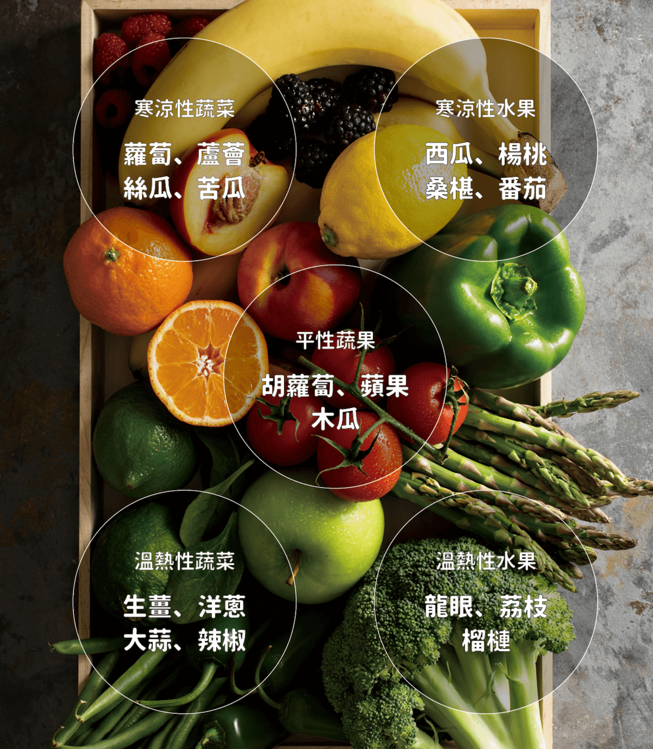 人的體質也分為寒熱虛實四類,依中醫診斷為準,代謝率低、手足冰冷、吹冷氣畏寒的寒性體質以及心悸、氣短的虛性體者,可適度攝取「溫熱性蔬果」;臉紅、燥熱、易口渴舌燥、喜愛冷飲與吹冷氣的熱性體質以及容易發熱、便秘的實性體質者,可適度攝取「寒涼蔬果」作保健。