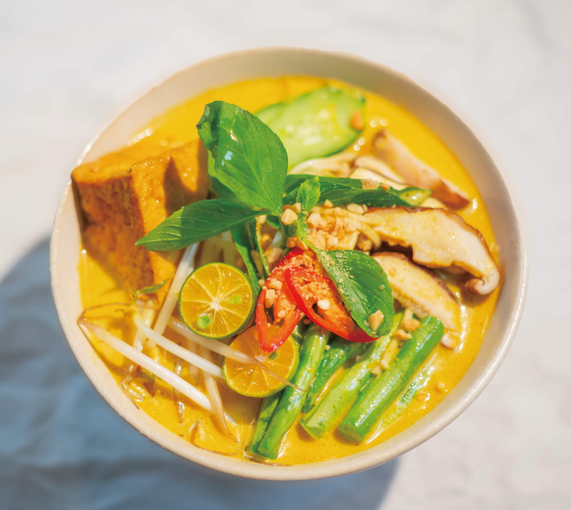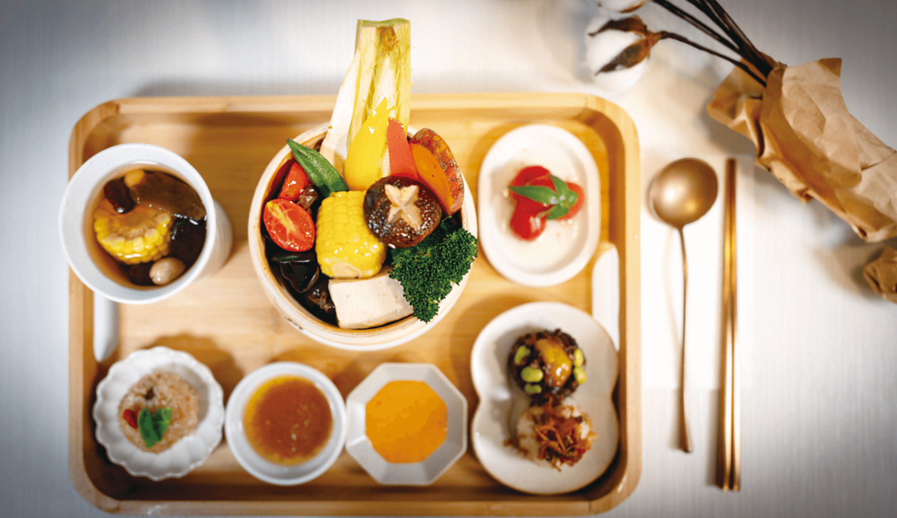 常不輕的菜色呈現,包括蒸籠蔬菜、手工現做飯糰、冷熱配菜、湯品皆以「原型食物」為主,為增加風味,還會搭配自製醬料,呈現食物多元風情;吳佩珊說,食材挑選上,盡量選擇當令蔬果,同時顧及配色,讓餐點呈現時,會有五顏六色的繽紛感,像是紅色的番茄、黃色的甜椒,橙黃色根莖類的地瓜、玉米,有時,還會加入特殊當令友善食材,例如虎尾有機的紫色馬鈴薯、官田有機菱角等,藉此支持友善農耕生產的食材「因此,在套餐中,不但可以吃到均衡營養,又能隨著季節感受不同的當令食材,也能品嘗到台灣在地農友對於種植食材的用心。」