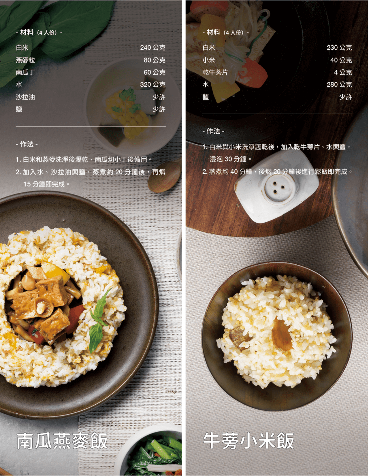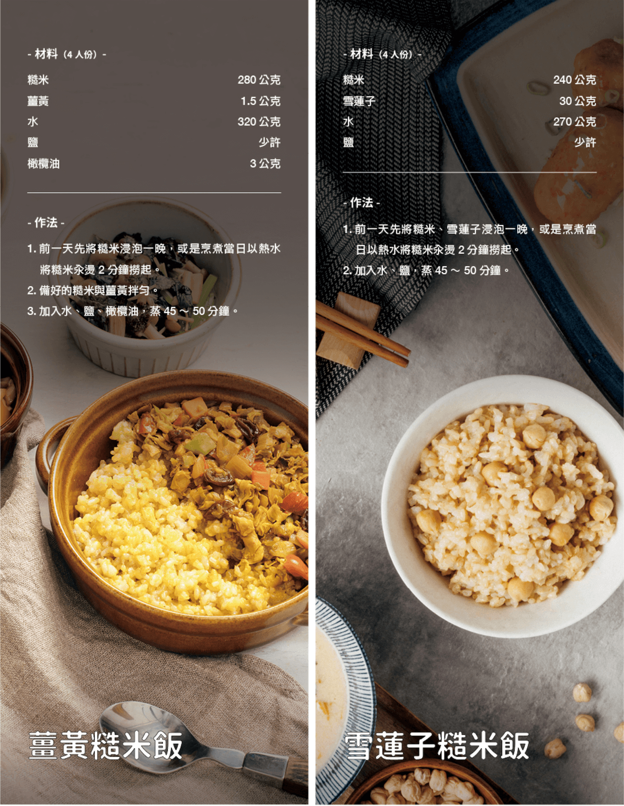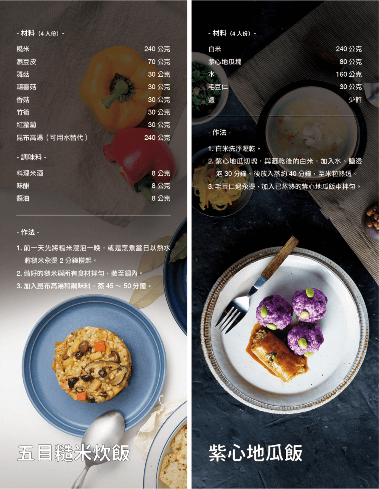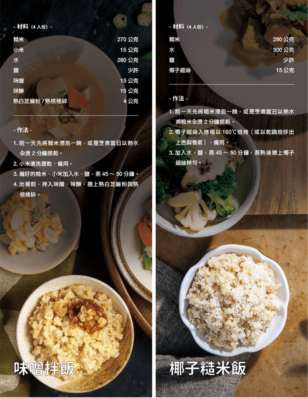 台灣人的餐桌上,就算擺上滿滿的好料,也總少不了一碗熱呼呼、好吃的米飯。米的營養價值完整且均衡,其中醣類是供給熱量的最大來源。現今養生風潮興盛,除了單純蒸煮米飯做為主食外,也可花點小巧思,將米飯搭配其他材料,完成各式各樣簡單又健康的米飯料理